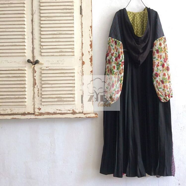 Material/Warna: Tenun Lurik Patchwork (sambungan patchwork menggunakan stik balik, jahitan depan dan belakang sama, lebih nyaman digunakan) & Pleats motif (Cerutti) & pleats polos (crepe) + Cotton silk halus (bagian baju yang bermotif bunga bunga besar) & katun rayon (polkadot) & Furing Rayon