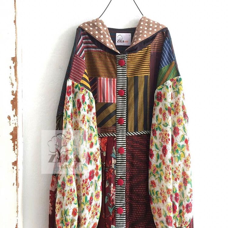 Material/Warna: Tenun Lurik Patchwork (sambungan patchwork menggunakan stik balik, jahitan depan dan belakang sama, lebih nyaman digunakan) & Pleats motif (Cerutti) & pleats polos (crepe) + Cotton silk halus (bagian baju yang bermotif bunga bunga besar) & katun rayon (polkadot) & Furing Rayon